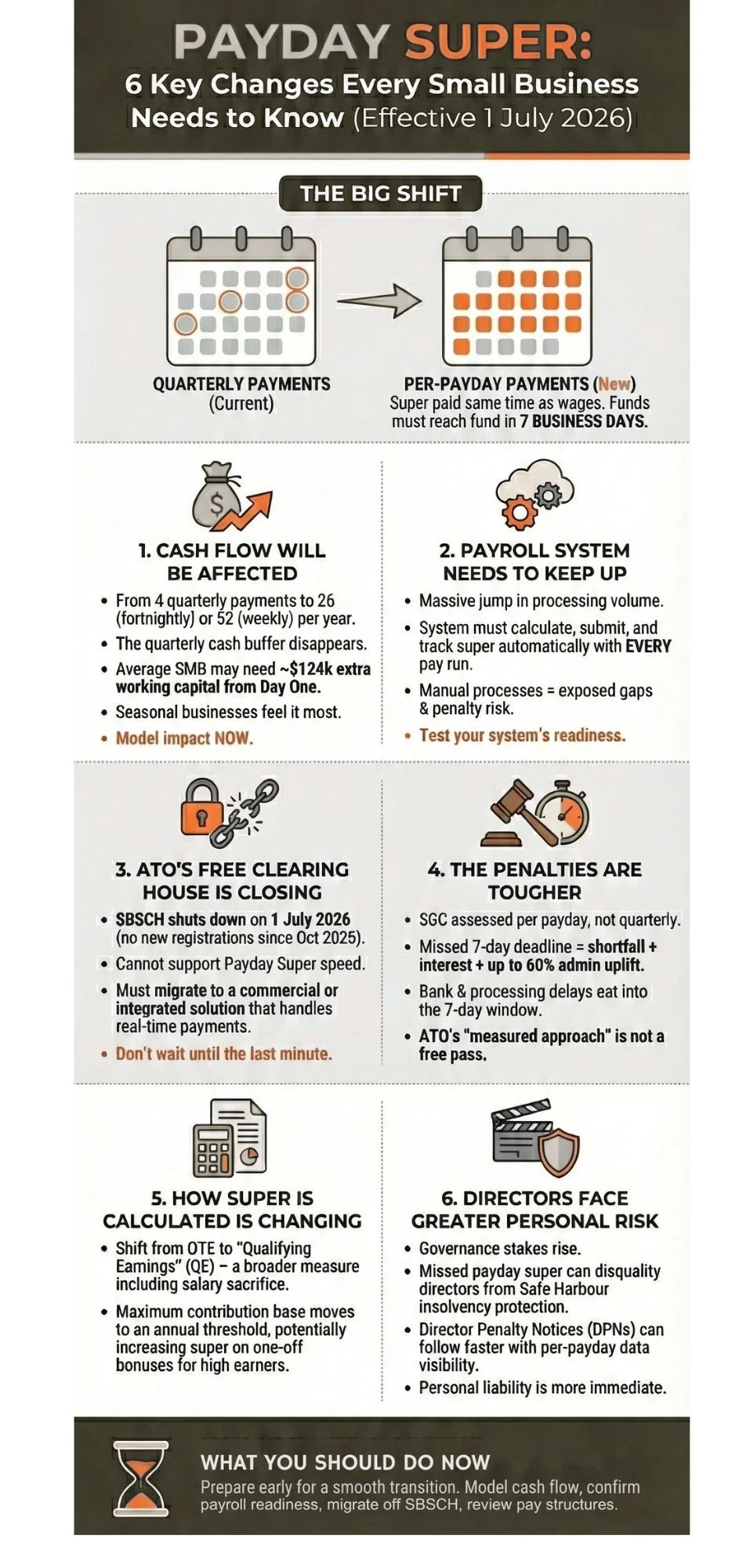 Five things. First, check your payroll software can handle super with every pay run — talk to your provider to confirm. Second, if you use the SBSCH, start moving to a new clearing house or integrated payroll solution now. Third, model your cash flow so you understand how more frequent super payments will hit your business. Fourth, make sure all your employee super fund details are up to date and correct. And fifth, talk to Glide Accounting sooner rather than later — the earlier you start, the smoother the transition.